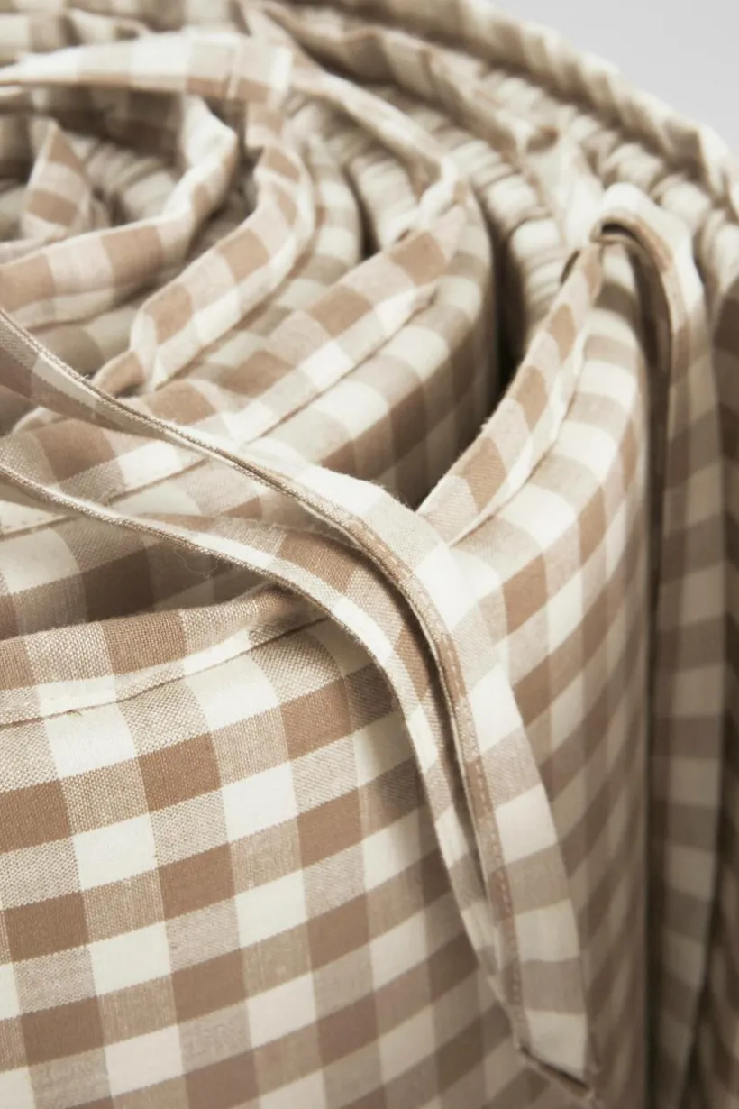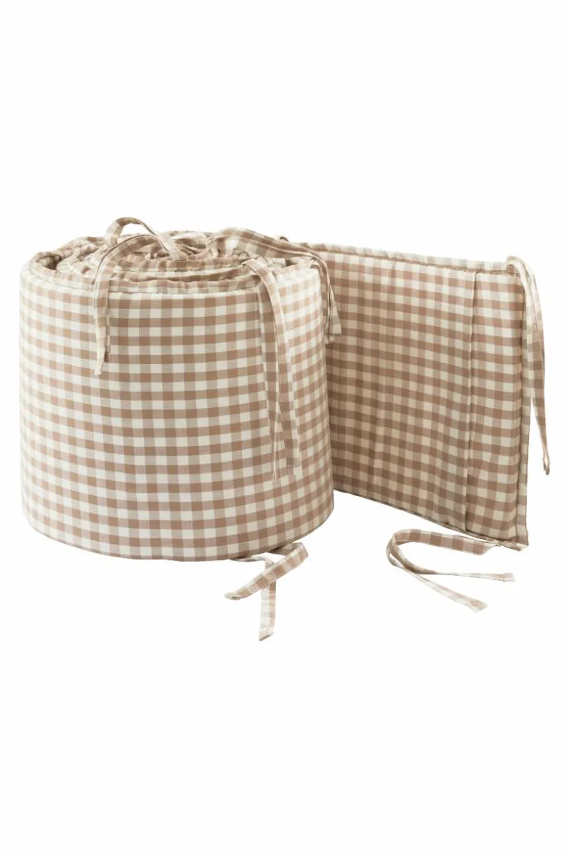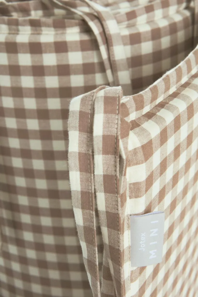 Spjälsängsskydd med yttertyg i ekologisk bomull med vävda rutor. Tyget är tvättat för att få en mjukare känsla och bomull känns svalt och skönt mot huden. De garnfärgade rutorna går i klassiska färger, lätta att matcha med annat. Fyllning av polyesterskum. Spjälskyddet gör spjälsängen mer ombonad och mysig, samtidigt som det hindrar barnet från att slå emot spjälorna i sömnen. Spjälsängsskyddet knyts fast med knytband. Yttertyget är avtagbart och tvättbart. Tygets gramvikt 119 g/m².