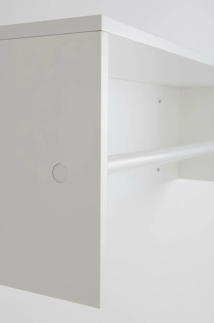 Maxvikt: Hyllans maxvikt är 10 kg och klädstångens är 5 kg, men vi vill poängtera att maxvikten är helt beroende av väggens bärighet och vilka skruvar som används vid montering.