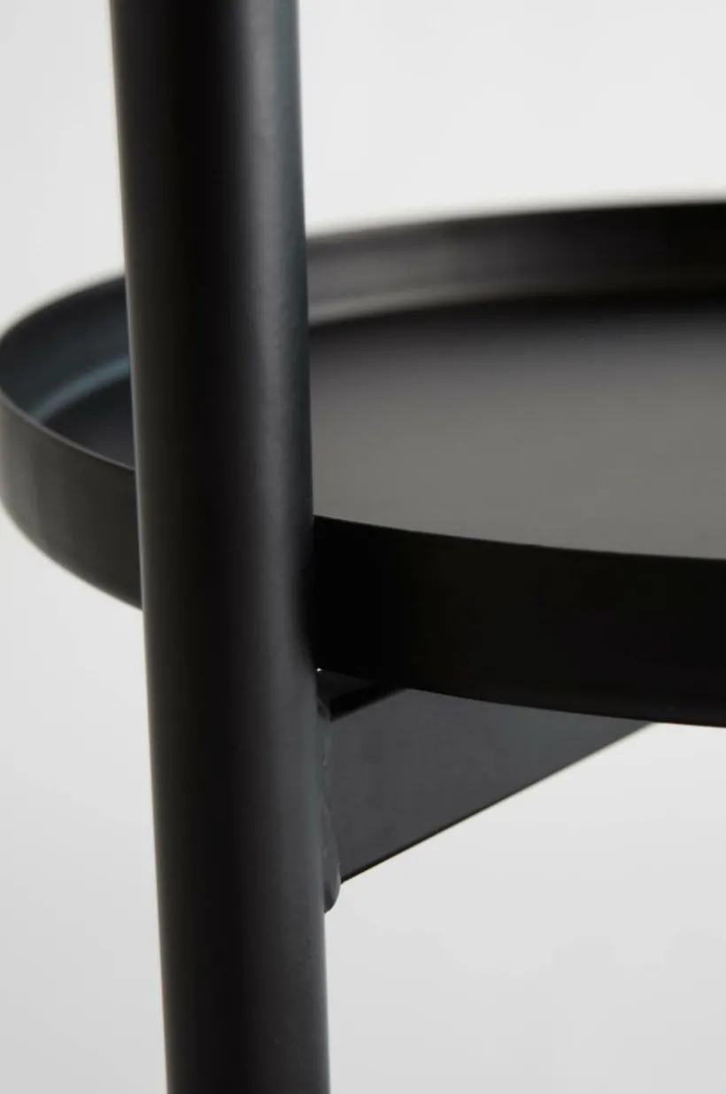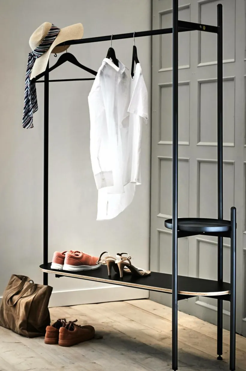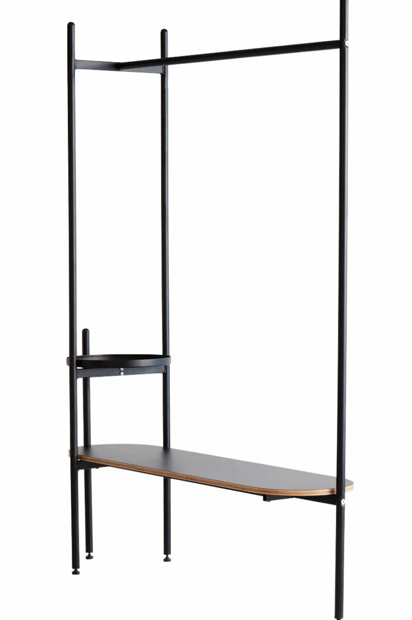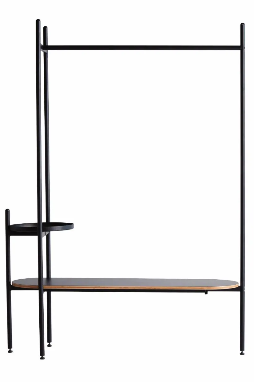 Beskrivning: Klädhängare med ställning och rund hylla i svartlackad metall, samt hyllplan i plywood av mangoträ med yta av tålig högtryckslaminat. Viss montering krävs.