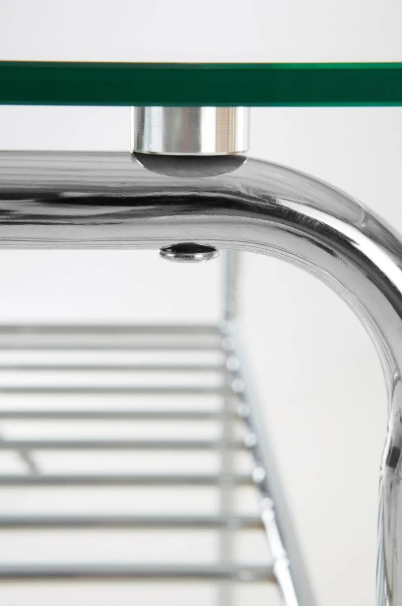 Sideboard med bordsskiva av härdat glas och metallstomme av kromat stålrör. Stommen har rundade hörn och möbeln andas 70-tal. Viss montering krävs. Monteringsanvisning medföljer.