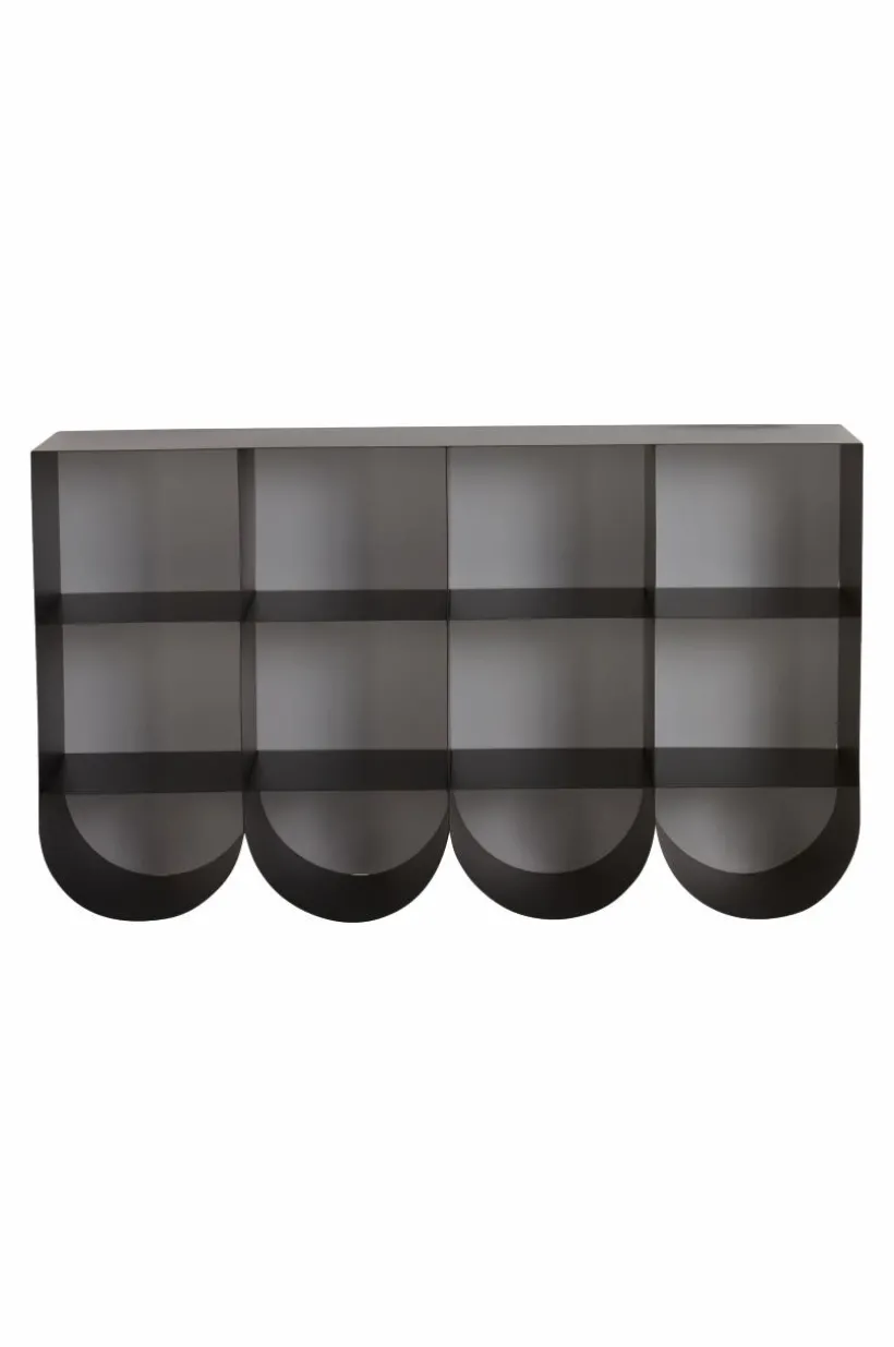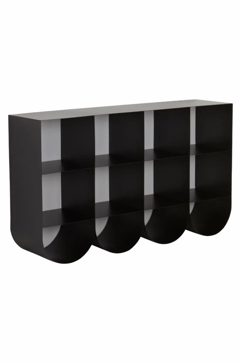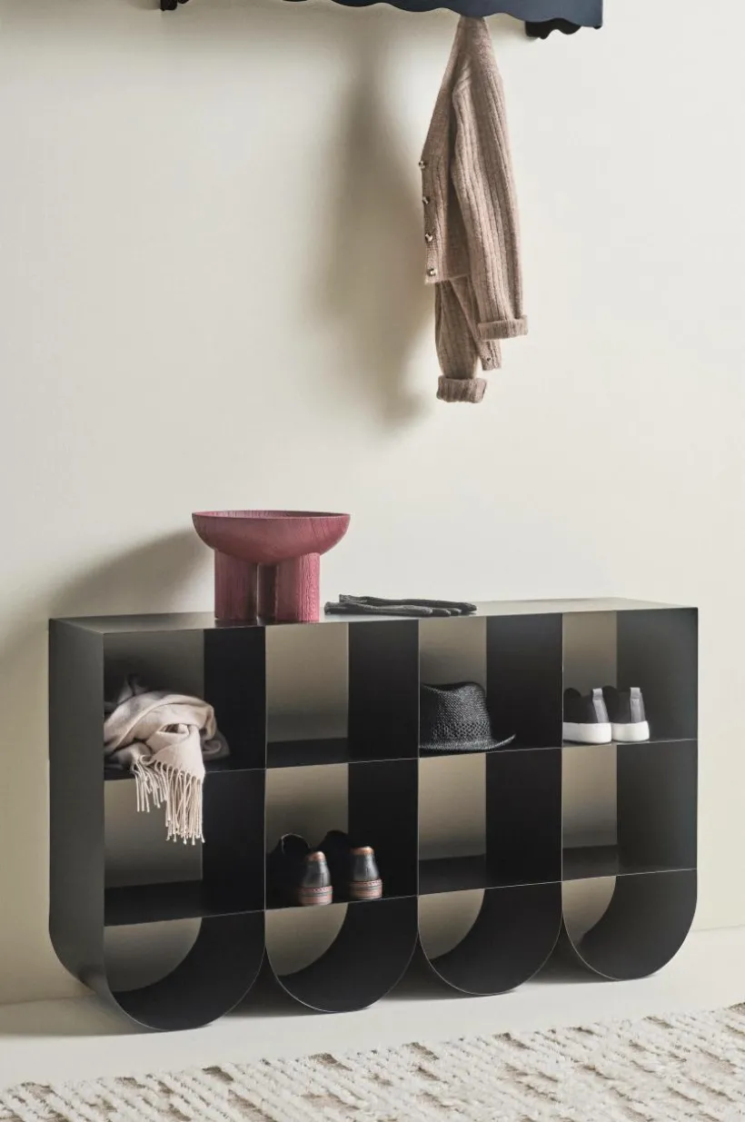 Skohylla av stål. Hyllan har charmig form med bågar nedåt och åtta fack för skor. Den kan förstås även platsa i barnkammaren med favoritleksakerna i. Hyllan har väggfäste baktill, så du kan fästa den mot väggen. Hyllan är målad med oljebaserad färg.