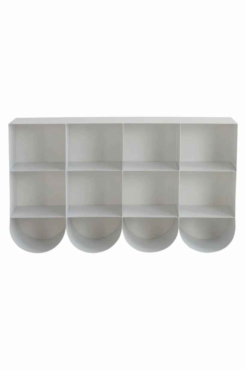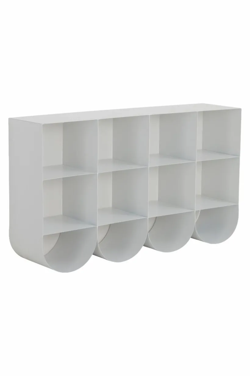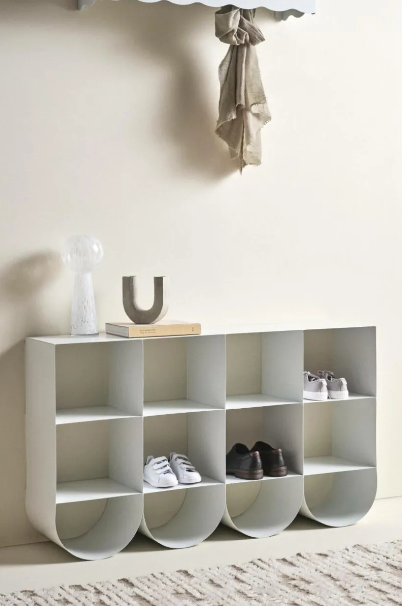 Skohylla av stål. Hyllan har charmig form med bågar nedåt och åtta fack för skor. Den kan förstås även platsa i barnkammaren med favoritleksakerna i. Hyllan har väggfäste baktill, så du kan fästa den mot väggen. Hyllan är målad med oljebaserad färg.