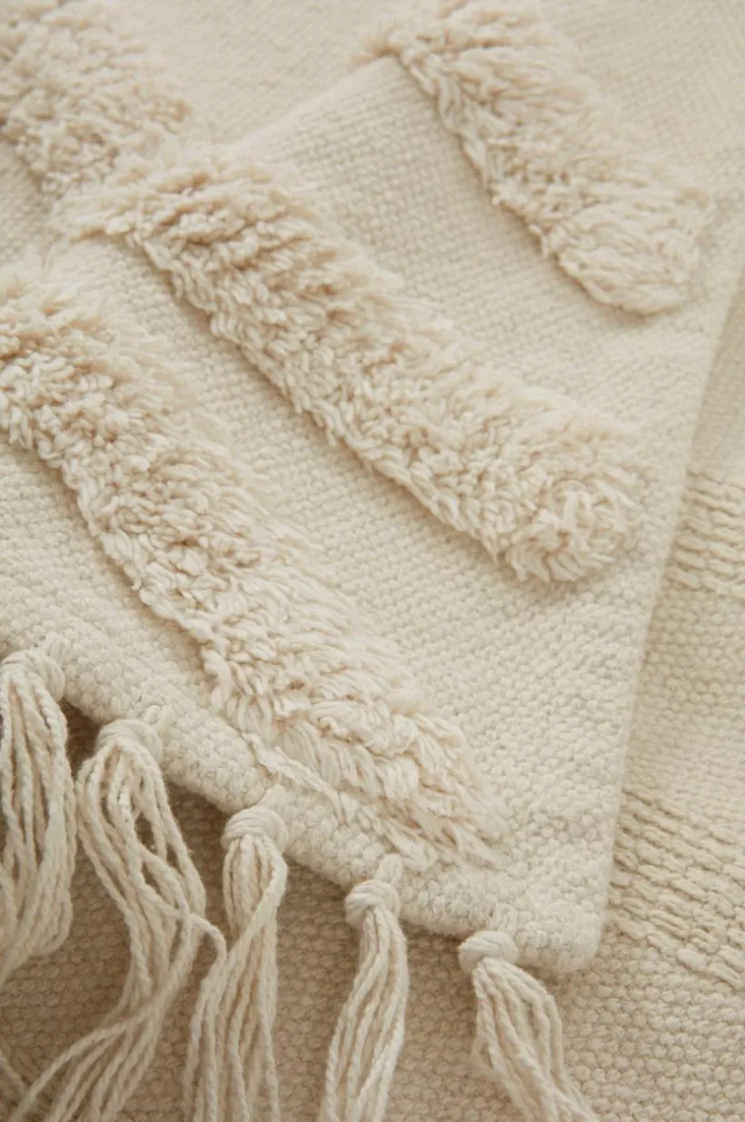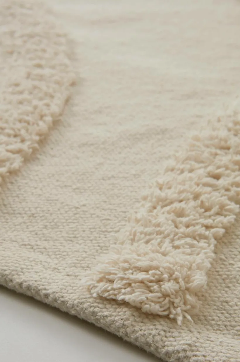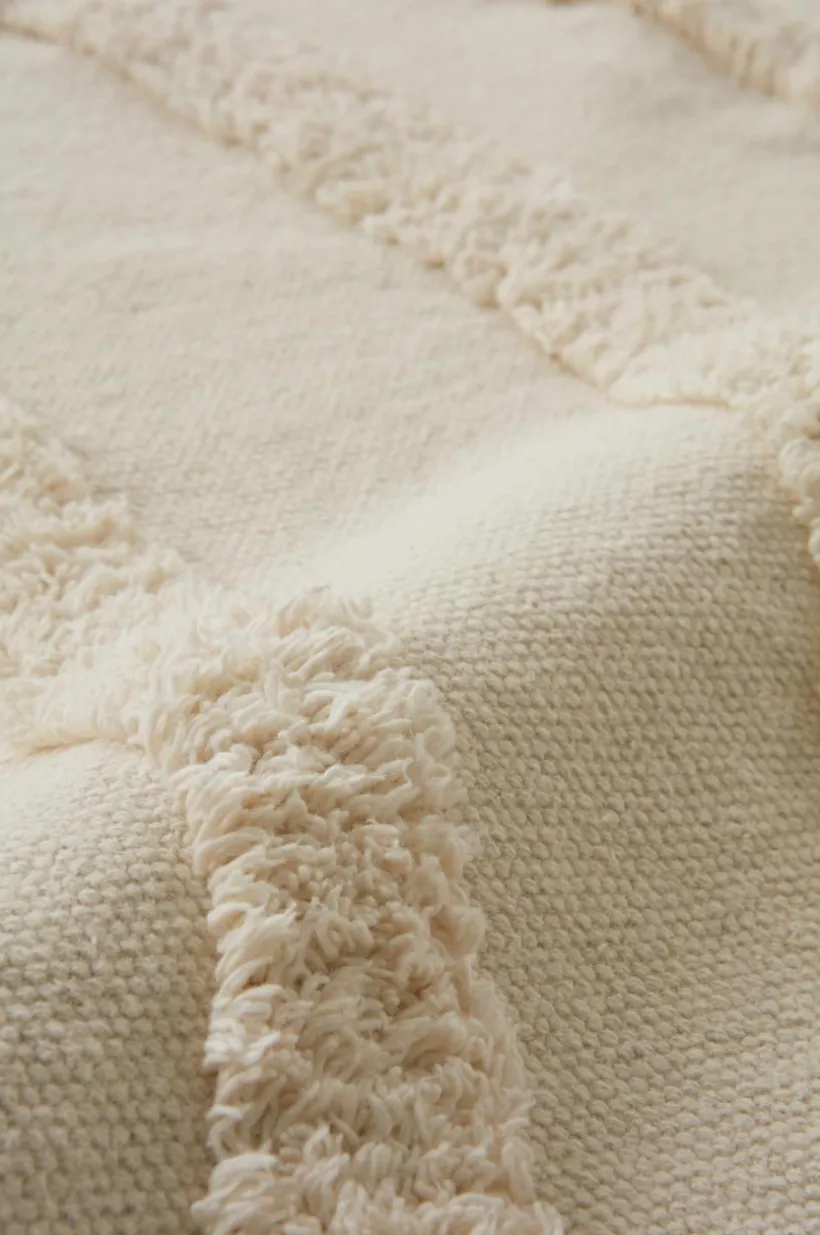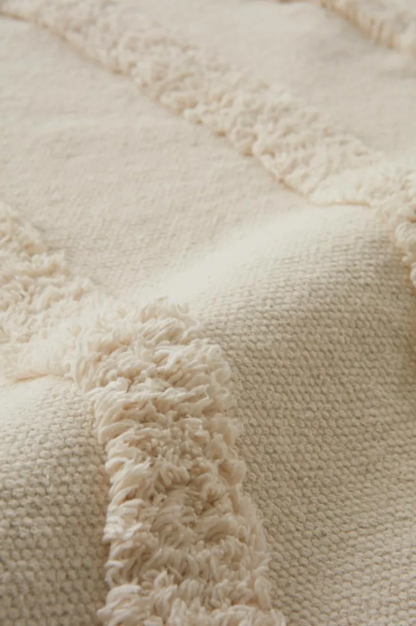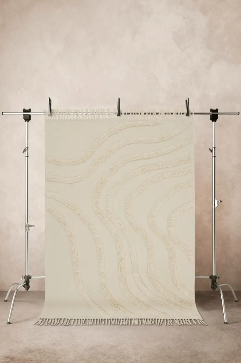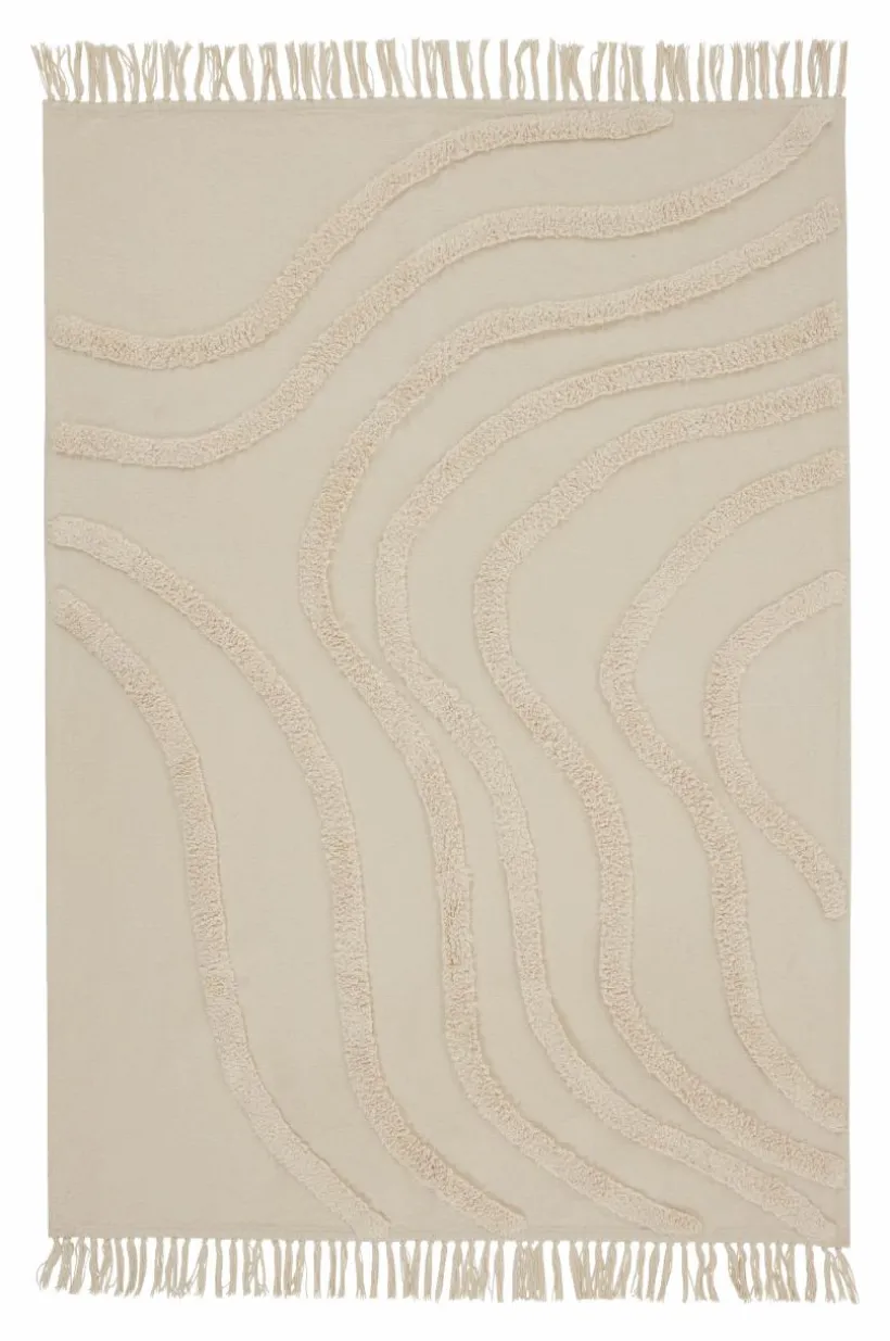 Vävd matta av bomull med tuftade ränder som skapar ett härligt vågmönster i luggenr. Mattan har en fin, knuten frans längs kortsidorna. Franslängd 8 cm. Lugghöjd 1 cm. Tjocklek 1,1 cm. 1235 g/m².
