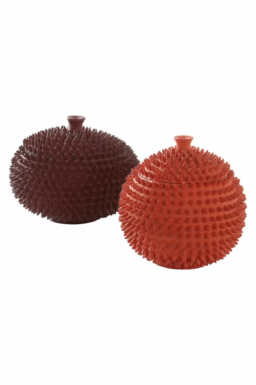 Rund ask med lock. YAVA är av polyresin. Förvara småsaker i en taggig förvaringsask som samtidigt blir en effektfull inredningsdetalj i ditt hem. Den nyfikne kan inte hålla sig borta. Ytan på YAVA är lätt kornig.