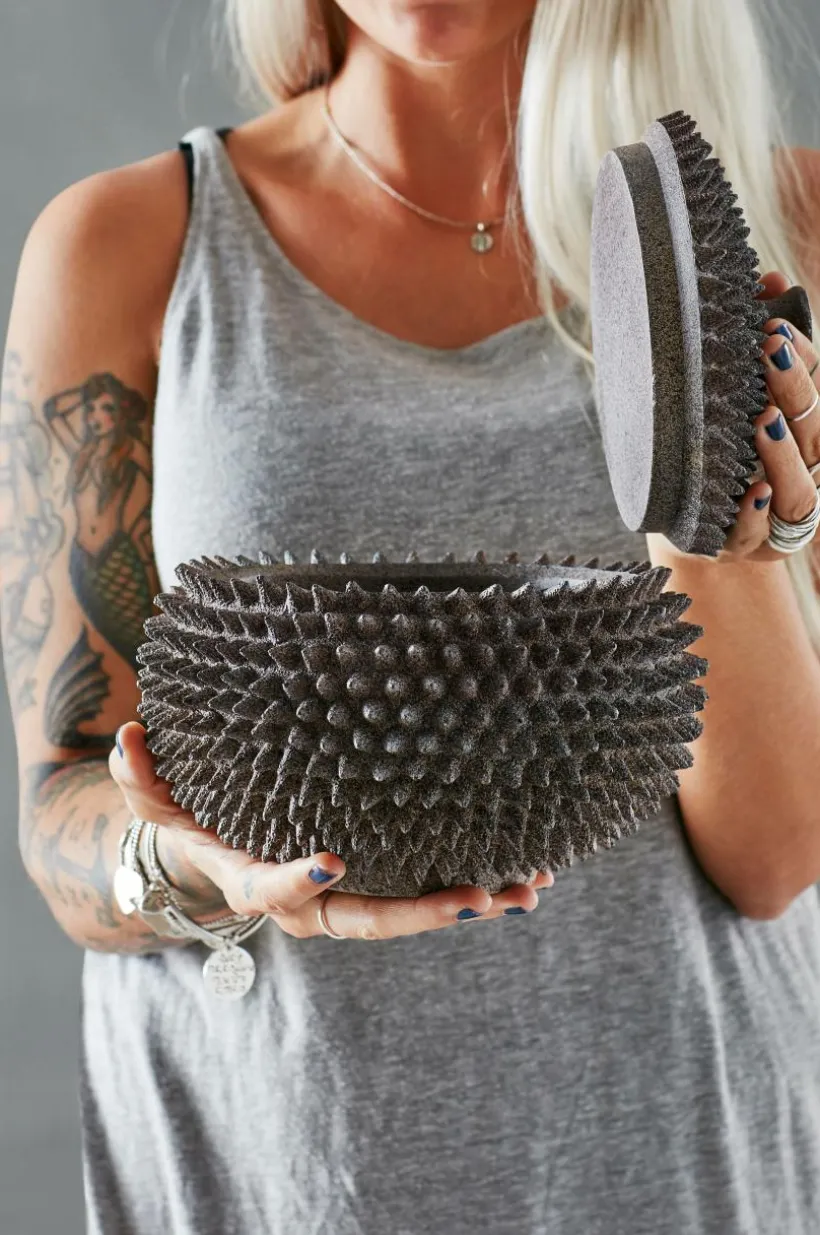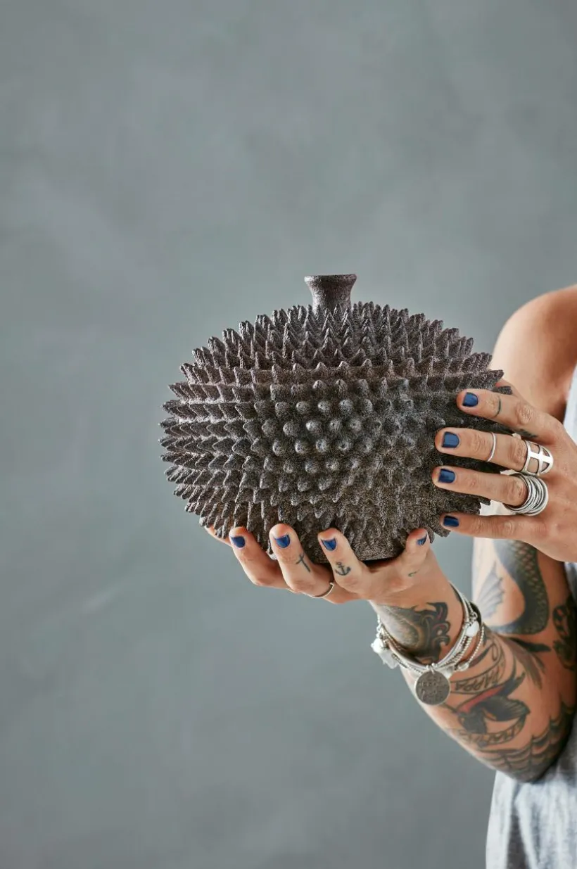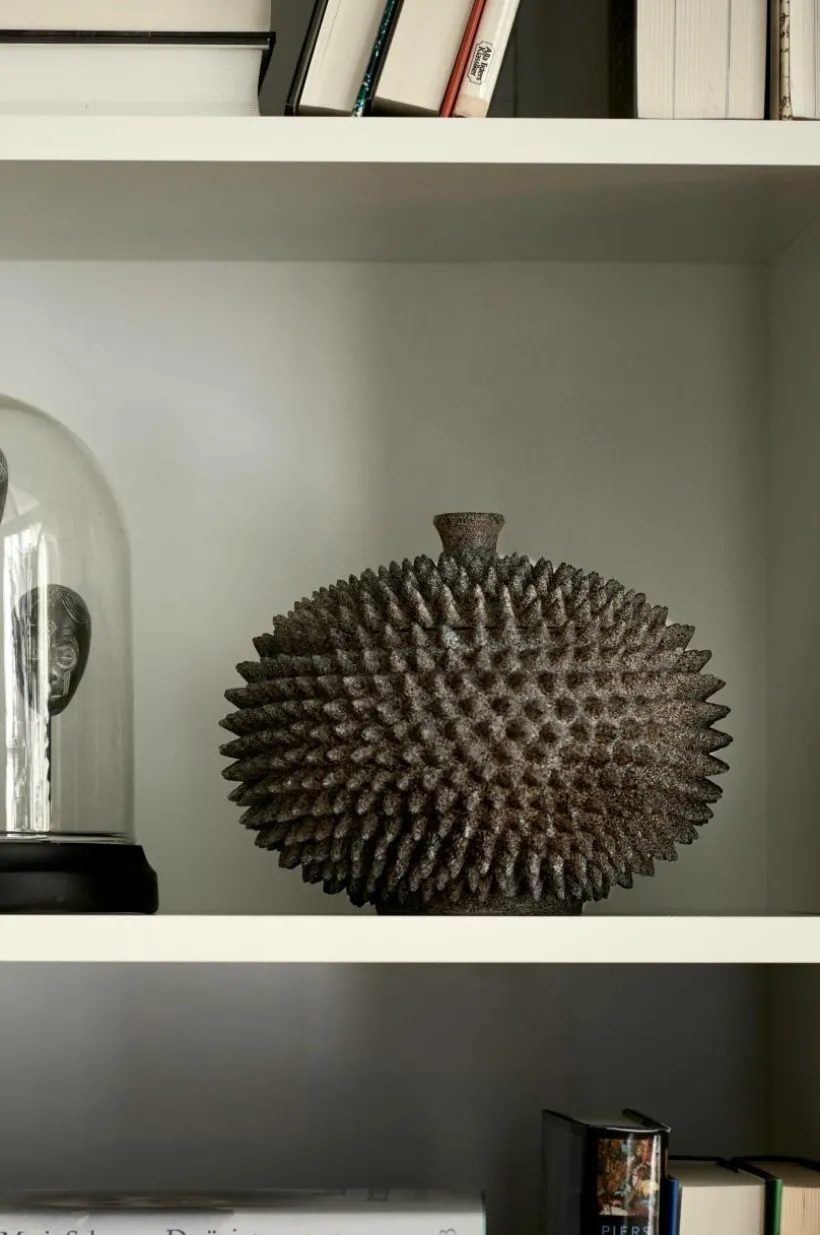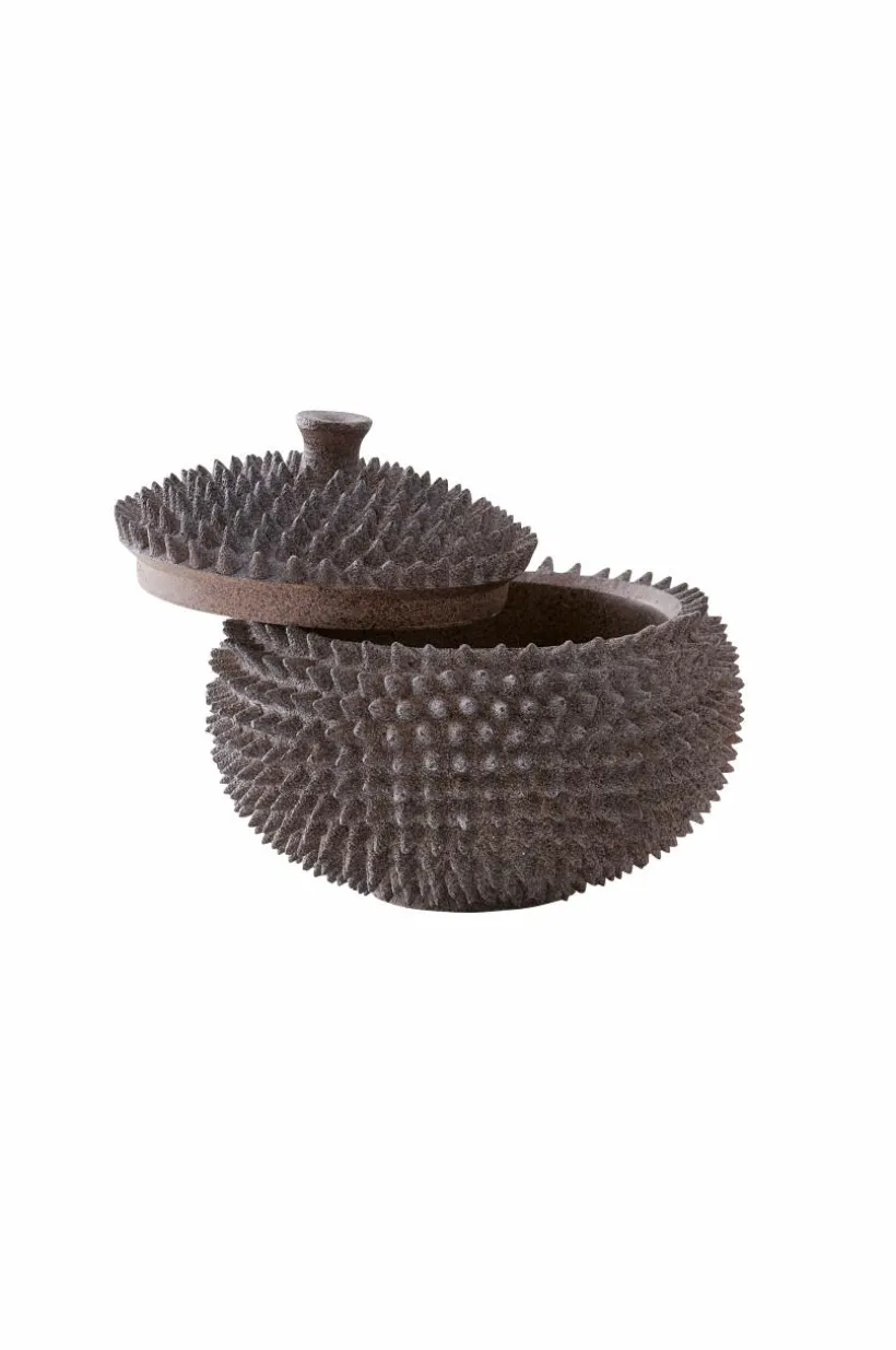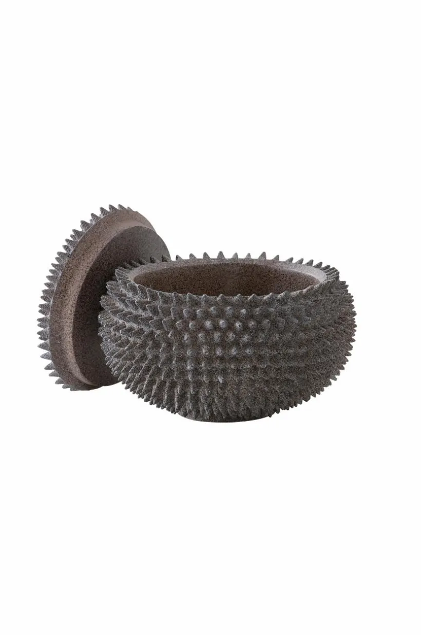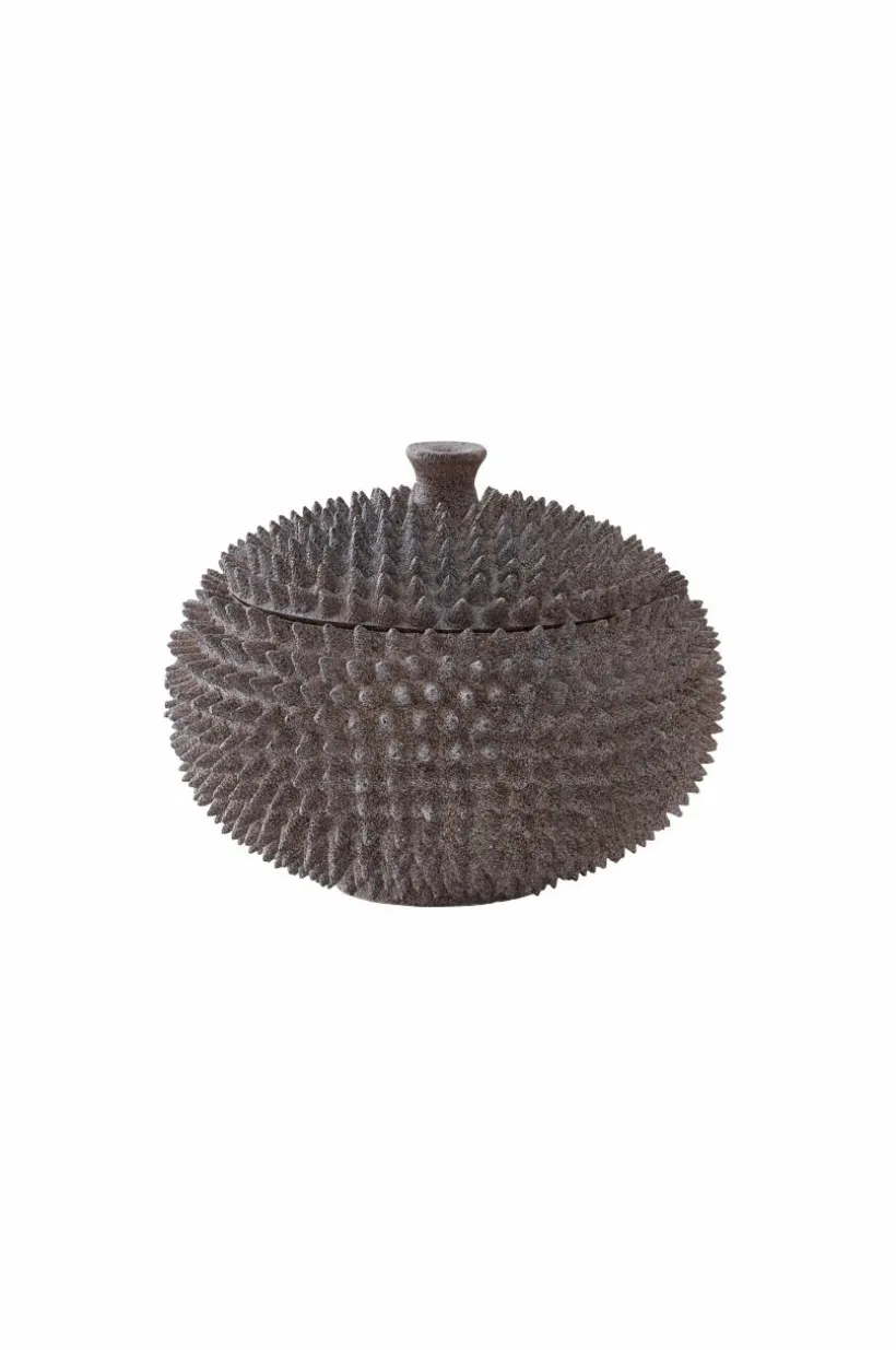 Rund ask med lock av polyresin. Förvara dina saker i en taggig förvaringsask som skapar en effektfull inredningsdetalj till ditt hem. Den nyfikne kan inte hålla sig borta. Den korniga ytan får asken att efterlikna sten.