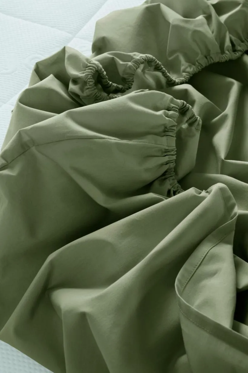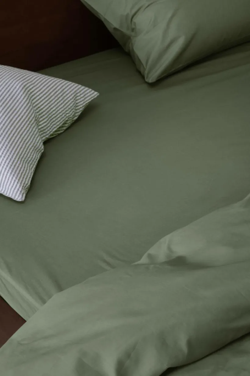 Enfärgat dra-på-lakan i underbar percale av ekologisk bomull med resår i hörnen. Percale är ett extra mjukt och behagligt tyg som vävts med tunna, fina bomullstrådar. Den elastiska kanten gör att lakanet sitter bra på madrassen. Trådtäthet på 200 tc. (Trådtätheten talar om antalet trådar, thread counts, per kvadrattum i ett tyg. Ju högre trådtäthet desto högre kvalité.)