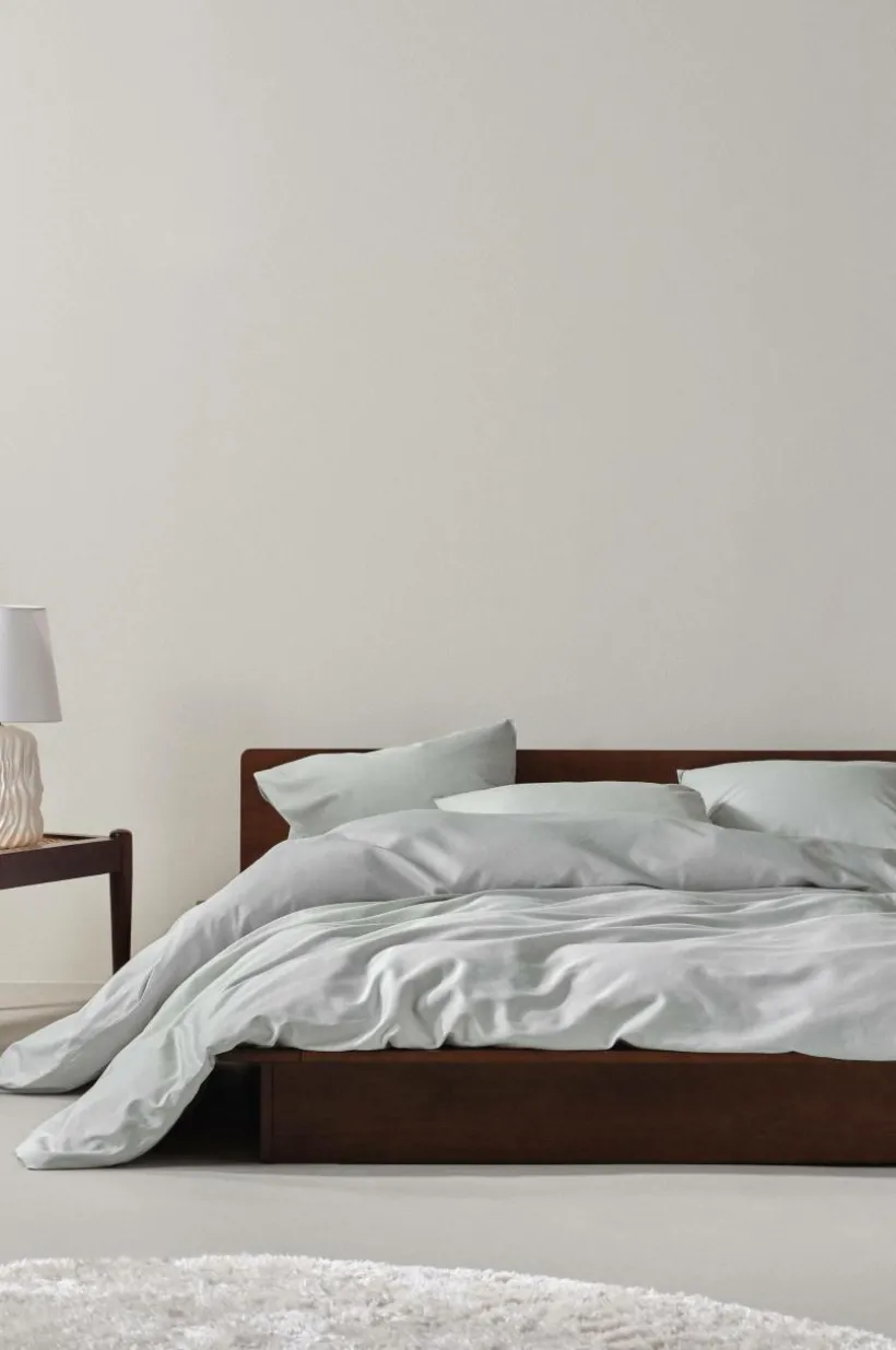 Enfärgat påslakanset i två delar, ett påslakan och ett örngott i exklusiv satin av ekologisk bomull. Satin är en vävteknik som ger ett underbart slätt, mjukt och lent tyg. Bomull som vävs med denna teknik ger ett tyg med fin lyster och lyxig känsla. Öppning i övre hörnen på påslakanet, som underlättar att trä påslakanet över täcket. Trådtäthet på 300 tc. (Trådtätheten talar om antalet trådar, thread counts, per kvadrattum i ett tyg. Ju högre trådtäthet desto högre kvalité.)