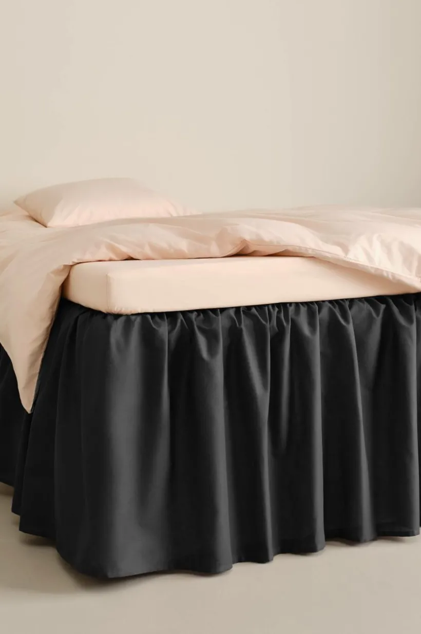 Sängkappa i enfärgad ekologisk bomull med volanger runt om. Denna sängkappa är anpassad för en lite högre säng. Att bädda i ekologisk bomull är luftigt, mjukt och lättskött. Perfekta sängkläder för stor som liten, för familjen på landet och för singeln i stan. Trådtäthet på 144 tc. (Trådtätheten talar om antalet trådar, thread counts, per kvadrattum i ett tyg. Ju högre trådtäthet desto högre kvalité).