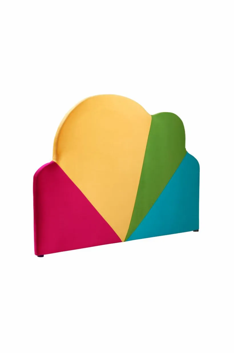 Molnformad, fristående sänggavel klädd i mjuk sammet. Tygets slitstyrka är på 28000 Martindale. Sänggaveln fästs på väggen med medföljande väggskena och kraftig kardborre.