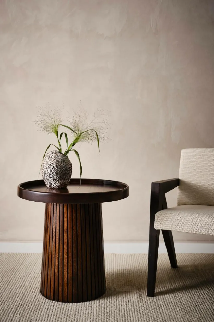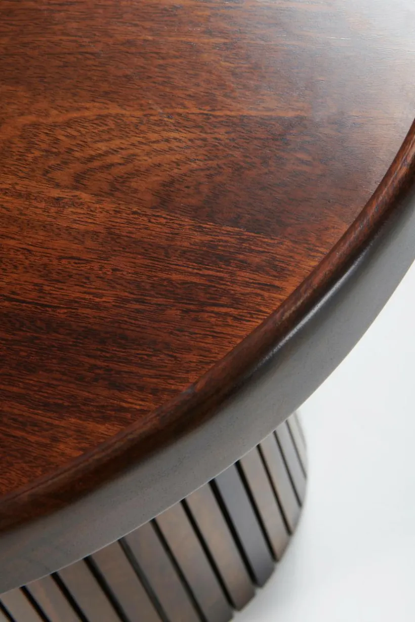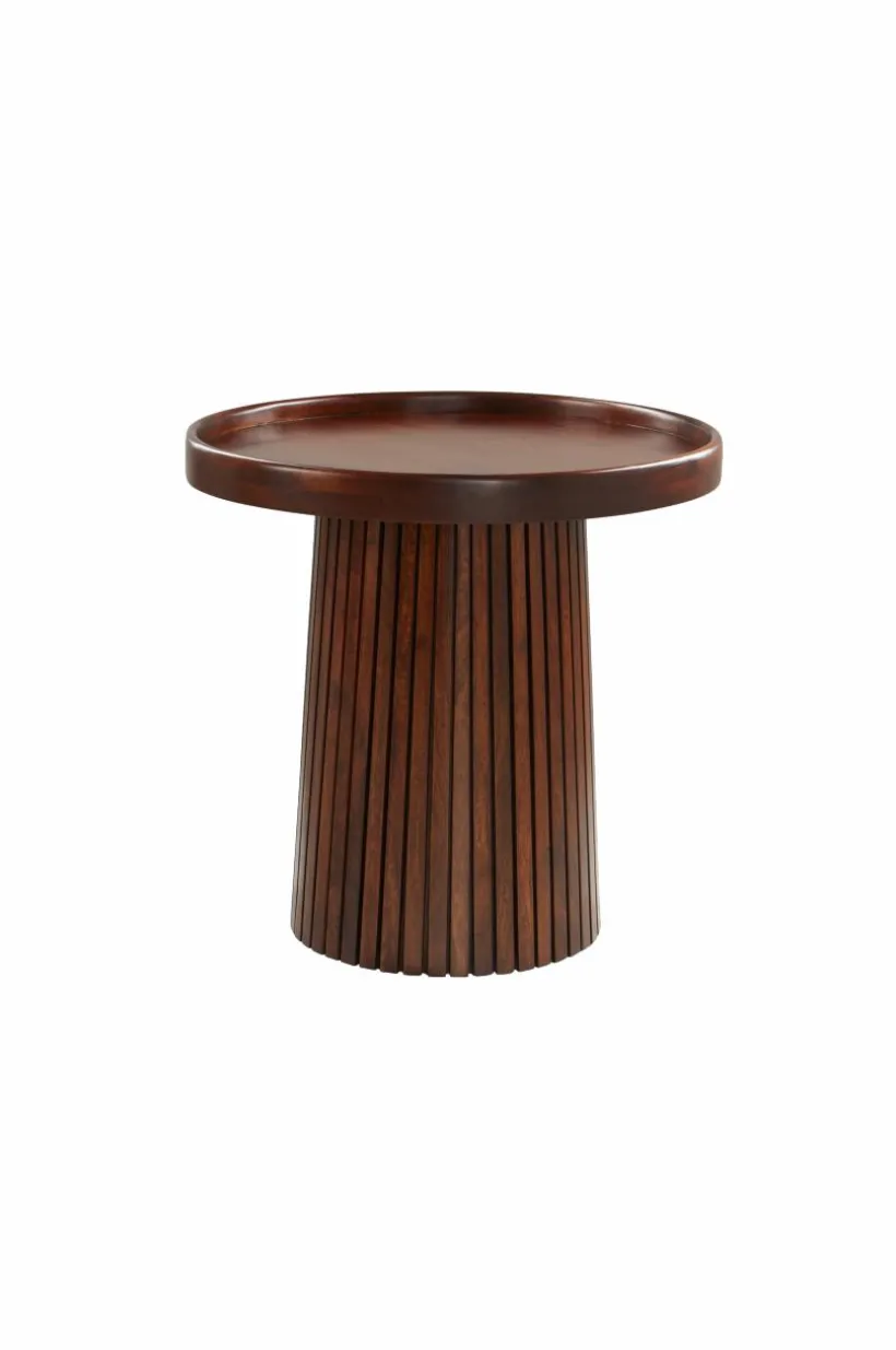 Sidobord av mörkt mangoträ och stål med en stadig, rund pelarfot. Ett stilrent bord i snygg form med upphöjd kant på bordsskivan. Viss montering krävs. Monteringsanvisningar medföljer.