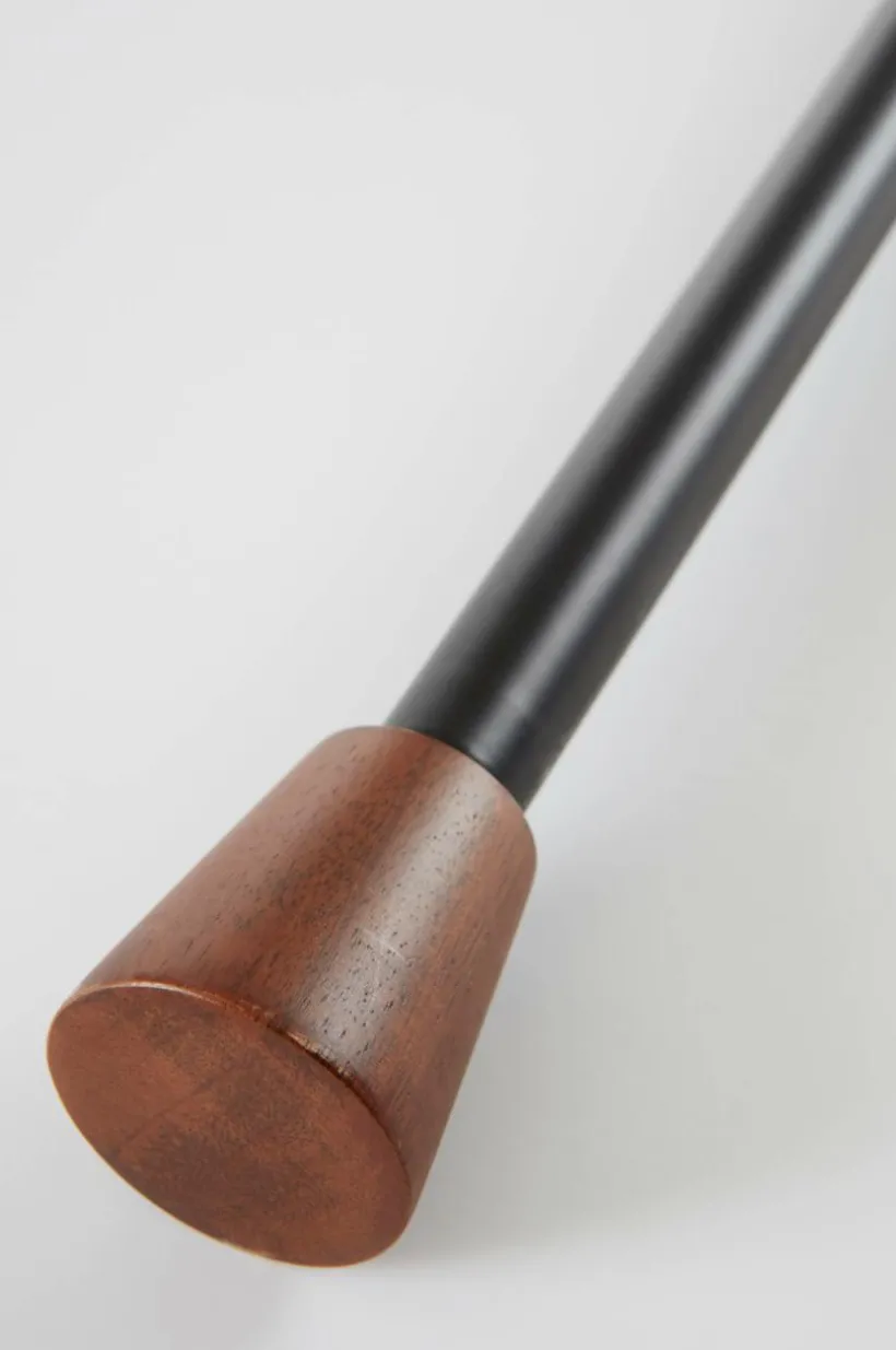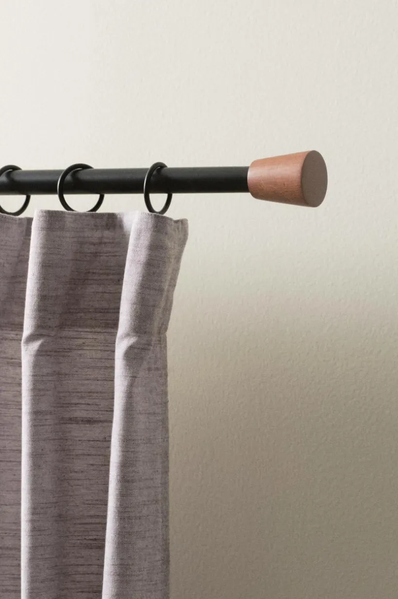 Gardinstång av järn med elegant formade ändknoppar av FSC-certifierat trä. Gardinstångens längd är justerbar. Ändknopparna skruvas på. Fem väggfästen, skruvar och plugg ingår. Observera att det alltid är underlaget som bestämmer vilken typ av infästning som är bäst lämpad för montering.